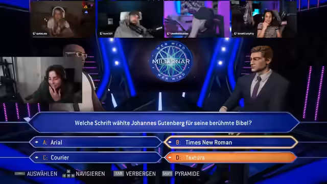 06:39:31Es wird diskutiert, ob es sinnvoller ist, eine neue Frage zu wählen oder den Chat-Joker zu verwenden. Die Gruppe entscheidet sich für eine neue Frage, um den Chat-Joker für die Millionenfrage aufzusparen. Nach der Beantwortung der Frage wird die Millionenfrage präsentiert. Die Teilnehmer sind unsicher und diskutieren verschiedene Optionen. Es geht um die Schriftart, die Johannes Gutenberg für den Buchdruck gewählt hat. Arial und Times New Roman werden aufgrund ihres modernen Ursprungs ausgeschlossen. Die Diskussionsteilnehmer versuchen, sich an das Aussehen alter Bibeln zu erinnern und überlegen, ob die Schriftart Serifen hatte. Es wird auch die Möglichkeit in Betracht gezogen, dass die Schriftart später den Namen Kurier erhalten hat, aufgrund der Verbreitung von Schriften durch Kuriere.