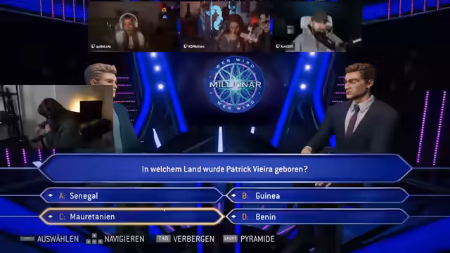 01:02:03Der Stream beginnt mit technischen Problemen bezüglich der Kameraeinstellungen, die sich als sehr fehlerhaft erweisen. Nach mehreren Versuchen, die Kamera scharfzustellen, gelingt es schließlich, und die Beteiligten können ins Spiel einsteigen. Es wird beschlossen, im Einzelspielermodus zu starten und bestimmte Themenbereiche wie Fußball, Manga, Star Wars und Harry Potter zunächst auszuklammern. Die anfänglichen Fragen erweisen sich als unerwartet schwierig, was zu einigen Unsicherheiten und fast falschen Antworten führt. Trotzdem gelingt es, einige Fragen richtig zu beantworten, wenn auch manchmal mit Glück und Intuition, was die Stimmung im Team hebt und die Hoffnung auf den Gewinn der Million aufrechterhält. Die anfänglichen Schwierigkeiten mit den Fragen und die knappen Entscheidungen tragen zur Spannung und Unterhaltung des Streams bei.