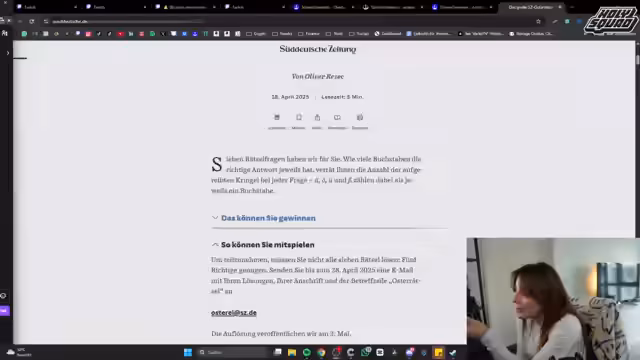 01:07:09Zu Beginn des Streams treten technische Probleme durch eine unerwartete Paywall auf. Nach dem Überwinden dieser Hürde wird das SZ Osterrätsel als Hauptthema des Abends vorgestellt. Es besteht aus sieben anspruchsvollen Fragen, die gemeinsam gelöst werden müssen. Das Ziel ist, die Koordinaten für einen geheimen Ort zu finden, an dem ein Osterei versteckt ist.