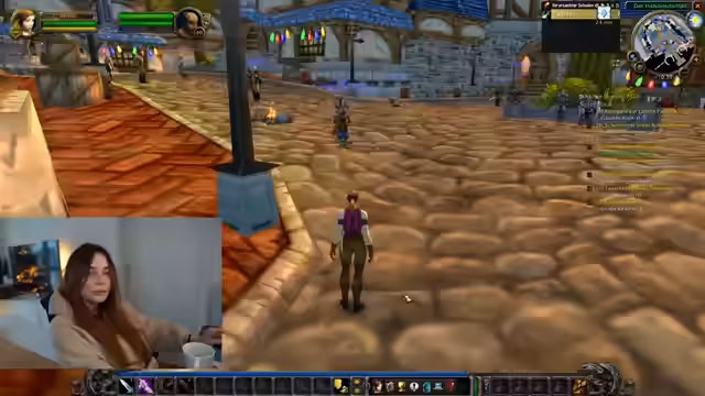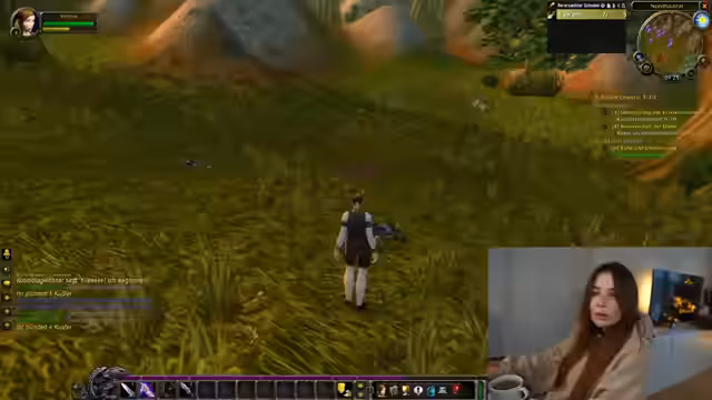 01:22:10Die Streamerin startet endlich das Spiel und beginnt mit den ersten Quests. Sie levelt schnell auf Level 2 und passt ihr Interface an, indem sie Actionbars und Autoloot einstellt. Sie muss sich nach 17 Jahren wieder an die Steuerung gewöhnen und sucht nach der Gilde 'Sauerkraut'. Beim Erledigen von Quests interagiert sie mit anderen Spielern und reagiert auf Nachrichten im Chat, während sie ihre Strategie für das Hardcore-Event bespricht.