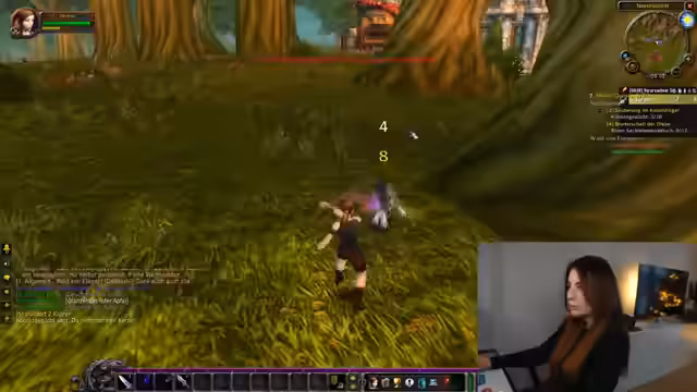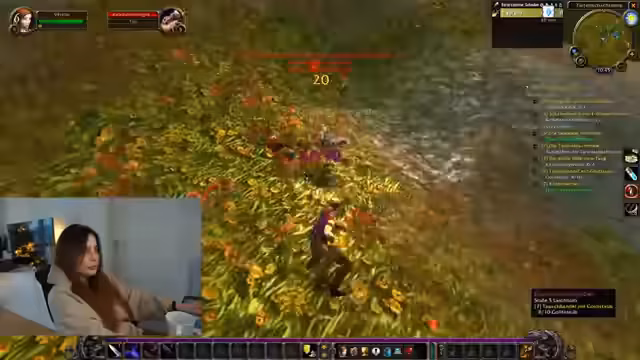 10:23:40Die Spielerin beginnt mit intensiven Kämpfen in der Welt und sucht nach spezifischen Gegenständen wie der Halskette des Knarzt-Clowns und einem Juwel. Sie beobachtet andere Spieler, die angreifen, und zeigt sich verwundert über deren niedriges Level trotz starker Kampffähigkeiten. Ein Highlight ist der Fund des ersten Tannenzapfens nach einer Stunde Suche, wobei sie den Chat um Hilfe beim Auffinden weiterer Exemplare bittet.