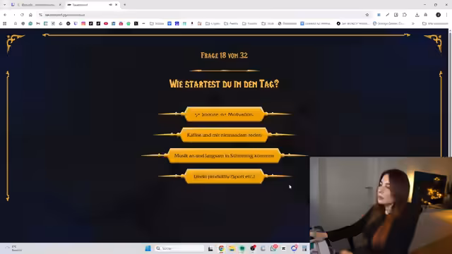 00:24:20Die Streamerin startet das Quiz, um ihre Rasse und Klasse für WoW zu bestimmen. Sie beantwortet persönliche Fragen wie ihre Vorlieben bei Unordnung, Entscheidungsverhalten und Stressfaktoren. Das Quiz führt sie durch verschiedene Hypothetische Szenarien und Persönlichkeitstests. Sie äußert den Wunsch, eine Nachtelf-Druidin zu spielen, da sie dies früher gespielt hat, ist aber offen für andere Optionen.