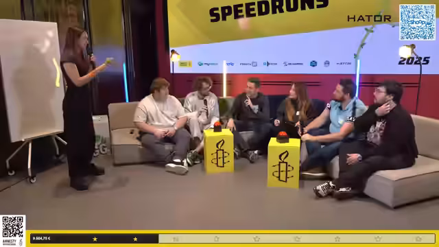 05:49:53Als letzte große Herausforderung im Quiz müssen die Teilnehmer die 20 Spiele mit den meisten Speedruns der Weltgeschichte nennen. Dies erweist sich als schwierige Aufgabe, da die Liste sowohl große Titel wie 'Minecraft' und 'Mario 64' als auch unerwartete Einträge wie verschiedene 'Roblox'-Spiele oder 'Getting Over It' enthält. Die Teilnehmer ringen mit der Frage, während der Moderator den aktuellen Spendestand für Amnesty International präsentiert und für weitere Spenden wirbt.