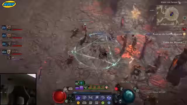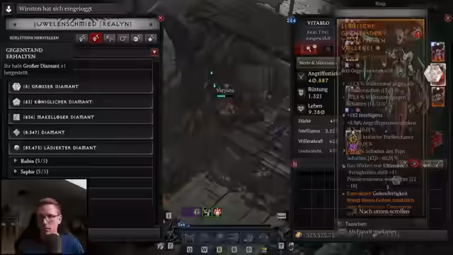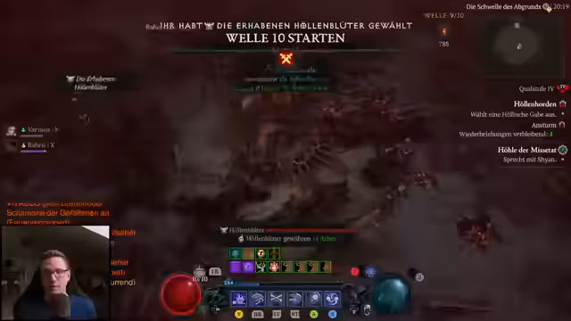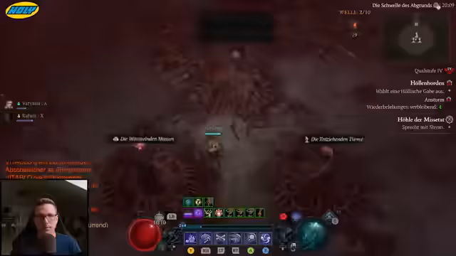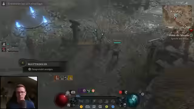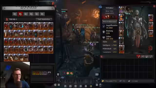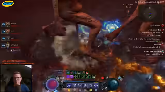 03:39:59Die Pit 100 Challenge steht im Fokus. Der Streamer farmt Items wie Ebenstecher und Glyphen, um sein Build für die 100er Grube optimal vorzubereiten. Dabei stellt er fest, dass das Finden von Chaos-Items wie dem Ebenstecher sehr zeitaufwendig sein kann. Er zeigt auch den Prozess der Verkaufen von ungewollten Items, um Inventarplatz zu schaffen. Während der Farming-Sessions interagiert er stark mit seiner Discord-Gruppe und streamt den Prozess des Lootens und der Gruppenaktivitäten.