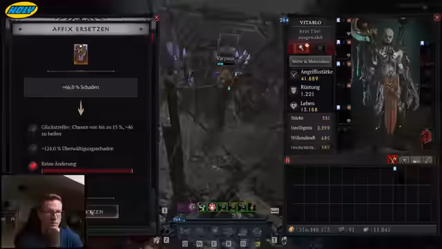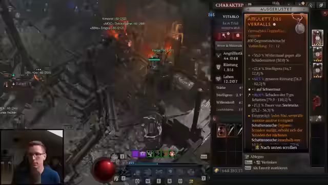 05:16:27Der Streamer geht auf die Charakterentwicklung in Diablo 4 ein. Er erklärt, wie der Zusatzwert für Barriere auf Amuletten und anderen Items ein wichtiger Faktor für seine Builds ist. Er findet es besonders ärgerlich, wenn gefundene Items wie Handschuhe mit statistisch nutzlosen Werten wie Glückstreffer-Chance oder kritischer Treffer ausgerüstet sind. Er demonstriert auch eine Axt, die nach eigenen Tests und Berechnungen für seinen Build vorteilhafter ist als ein Schwert, weil die kleineren Seelen-Geister ebenfalls Schattenseuche auslösen können und die Anzahl der gleichzeitig nutzbaren Zauber limitiert ist.