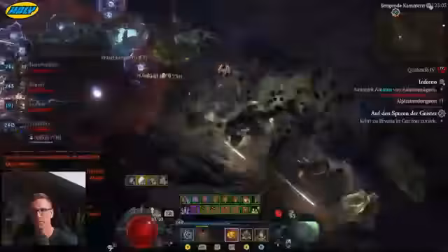 01:59:26Ein technisches Problem mit dem Weltboss-Crash, möglicherweise verursacht durch Todesfalle, wird angesprochen. Der Streamer geht davon aus, dass der Bug mit der Popularität des Builds zusammenhängt. Parallel dazu wird das Farmen von Seelen in Dungeons getestet. Es zeigt sich, dass Truhen für alle Gruppenmitglieder lootbar sind, wenn einer sie öffnet, was die Effizienz im gemeinsamen Gruben-Farming steigert.