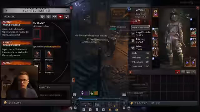 03:46:40Nachdem alle wichtigen Härtungsrezepte gefunden wurden, verlagert sich der Fokus auf die Optimierung des Builds. Items werden gehärtet und mit neuen Aspekten wie GA Geschicklichkeit oder GA Max Life ausgestattet. Der Streamer stellt fest, dass sein Build für Qual 3 ausreicht und plant, den nächsten Schadenshebel durch den Level-Up eines legendären Paragon-Knotens zu aktivieren, um noch stärker zu werden.