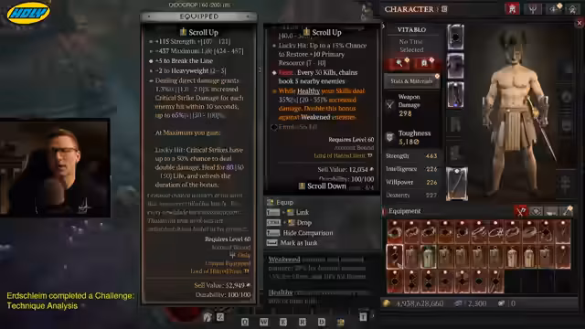 00:39:23Um die neuen Inhalte sinnvoll zu testen, entscheidet sich der Streamer, einen Paladin-Build zu erstellen. Er führt eine Abstimmung im Chat durch und wählt aufgrund des Ergebnisses den Auradin-Build. Während des Aufbaus des Builds stellt er erste Änderungen in den Aspekten fest, etwa den Wegfall des Aspekts der Salbung.