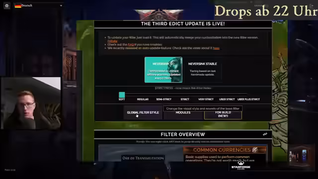 03:50:24Die Vorbereitungen für den Start der neuen Liga umfassen persönliche und technische Aspekte. Stream-Viewer teilen ihre individuellen Rituale mit, von Liegestützen bis hin zum Trinken von Schnaps. Der Streamer bereitet sich mit einer Nektarine und Wasser vor. Technisch wird der Loot-Filter von Filterblade eingerichtet, wobei zunächst auf den 'Soft'-Modus für Kampagne-Anfang und 'Regular' fürs Endgame eingestellt wird. Dies soll das Highlighten wichtiger Items ermöglichen, ohne das Spiel zu überladen.