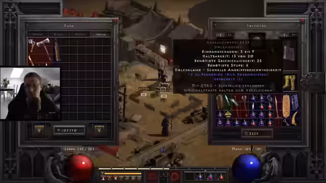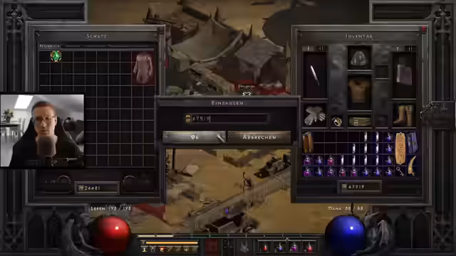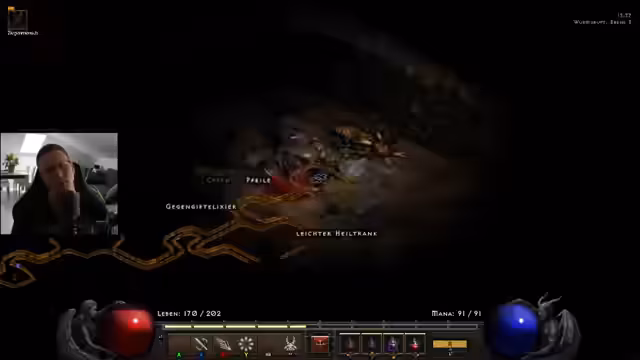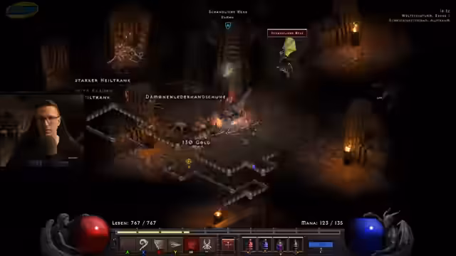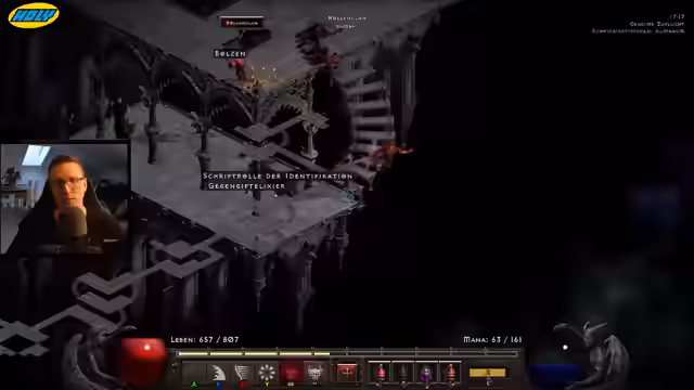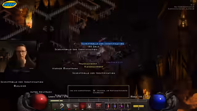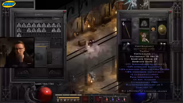 00:17:14Der Streamer findet bereits früh im Spiel sehr gute Gegenstände. Er holt sich den XP-Schrein und ist kurz davor, ein Level zu erreichen. Gleichzeitig findet er ein starkes Paladin-Zepter mit vielen nützlichen Fertigkeiten und Gold, das er direkt für Tränke verwendet. Er erkennt an, dass man in der Höhle des Bösen viel Pech haben kann und daher ein goldgebendes Item frühzeitig Gold für Tränke ermöglicht. Der erste Abstieg erfolgt erfolgreich, während der Streamer die frisch gefundenen Items sammelt und verkauft.