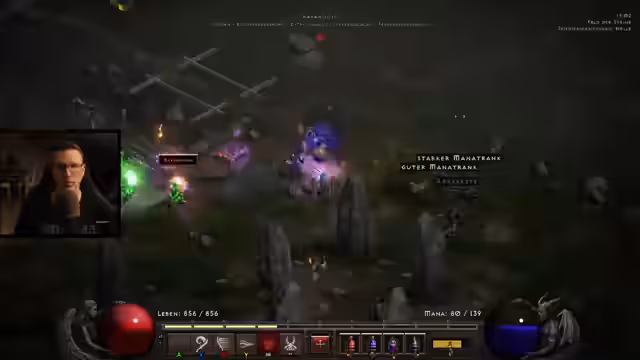 09:43:53Im Kanalgebiet von Akt 4 wird der Streamer von einer ungewöhnlich hohen Konzentration von Helden- und Championpuppen direkt am Eingang überrascht, was für einen HC-Spieler ein Albtraum ist. Trotzdem gelingt es ihm, die Puppen zu besiegen, muss aber feststellen, dass er permanent vergiftet ist. Er ist frustriert über seine Leistung und stellt die Frage, warum es im aktuellen Let's Play so viel besser lief. Immerhin findet er einen wertvollen Dual Leech Ring mit Kälteresistenz, den er jedoch aufgrund eines fehlenden FCR-Breakpoints zunächst nicht nutzen kann.