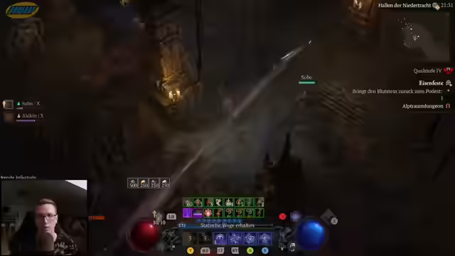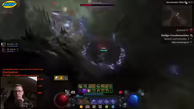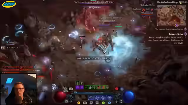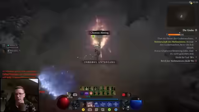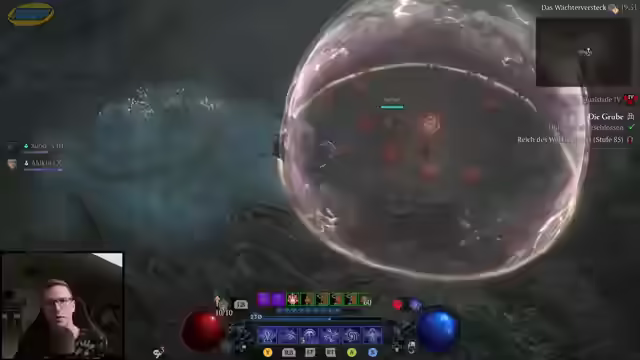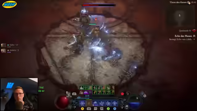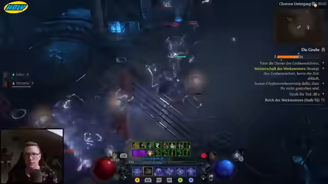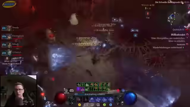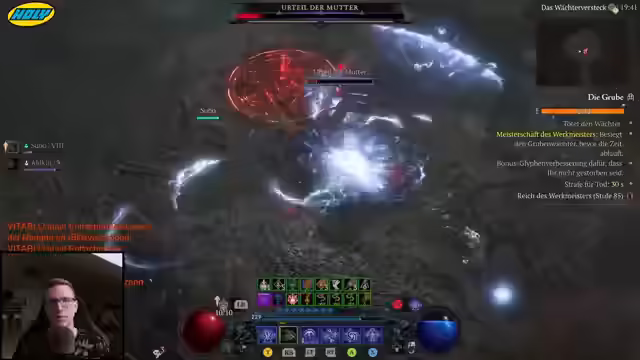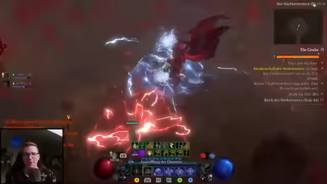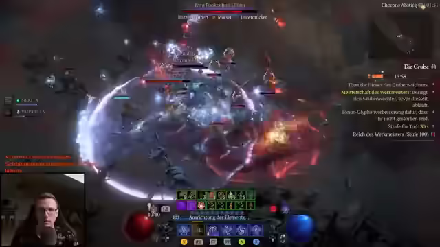 Der Fokus liegt auf der Pit 100 Challenge mit verschiedenen Zauberer-Builds, darunter Kugelblitz und Feuerball. Es werden Runen und mythische Funken gefarmt, Builds angepasst und das Endgame-Update besprochen. Der Streamer testet HDR-Einstellungen, kauft Starcraft-Skins und optimiert seine Ausrüstung, um den Schaden zu maximieren. Es gibt Diskussionen über Build-Nerfs, Leveldesign und Item-Upgrades.