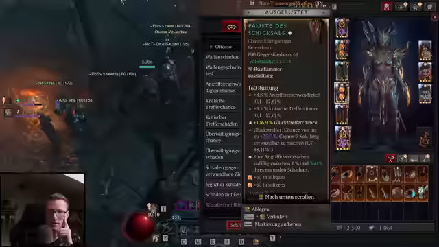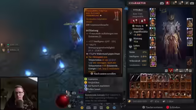05:15:43Es wird Gold benötigt, um Ausrüstung aufzuwerten und das Pit-Pushing voranzutreiben, sowie Glyphen zu leveln. Es wird festgestellt, dass der Zeitplan für den Tag nicht eingehalten werden kann. Der Streamer äußert sich enttäuscht über das seltene Auftreten von Ätherfürsten. Es wird die Möglichkeit erwähnt, Runen im Chat zu tauschen. Der Streamer tauscht Runen mit Zuschauern, um benötigte Items zu erhalten, und bietet Gold im Gegenzug für Ohm-Runen an. Nach erfolgreichen Trades wird ein Ring hergestellt. Es wird überlegt, welche Greater Affixe (GA) für den Ring am besten geeignet wären, wobei Attack Speed und Kernränge als optimale Optionen genannt werden. Der Streamer hat Glück und erhält beide gewünschten Affixe, was die Effektivität von Knisternder Energie erhöht. Alberic wird für seine Hilfe beim Finden von Triple-Hit-Attack-Speed gedankt, was sich als wertvoller herausstellt als erwartet. Der Fokus liegt nun auf der Optimierung des Builds für maximalen Schaden, wobei Fertigkeitspunkte neu verteilt werden, um Willenskraft zu maximieren und den nötigen Bonus zu erreichen. Es wird nach weiteren Quellen für Attack Speed gesucht, und verschiedene Optionen werden in Betracht gezogen. Der Streamer nimmt Augentropfen.