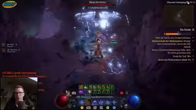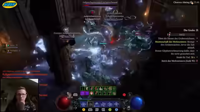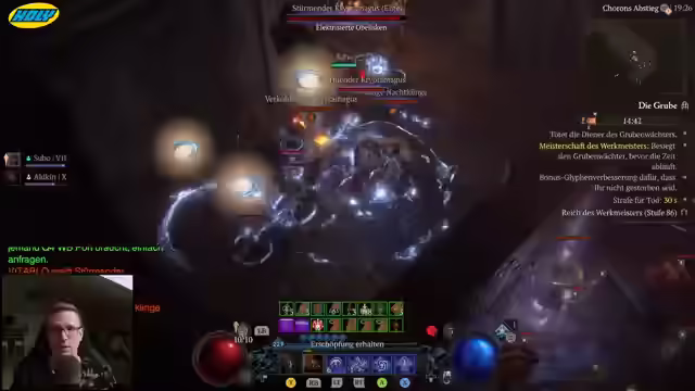 00:25:31Es wird die Schwierigkeit betont, 15 Chaosportale in 30 Minuten zu finden und zu absolvieren. Es wird überlegt, ob Albtraum-Dungeons eine Alternative darstellen könnten. Der Streamer lobt einen Moderator für seine Arbeit und äußert sich positiv über die Community, in der es selten zu negativen Vorfällen kommt. Es wird die Low-Budget-Variante des Knisterenergie-Builds auf Combo-Blitze umgestellt, um den Übergang besser abzubilden. Der Streamer erwähnt, dass er Schwierigkeiten hat, Subs im Stream mitzubekommen. Es wird überlegt, dass die Sub-Alerts zu oft kommen und daher nicht mehr als solche wahrgenommen werden. Der Fokus liegt darauf, Chaosportale zu finden, um die Saisonreise abzuschließen.