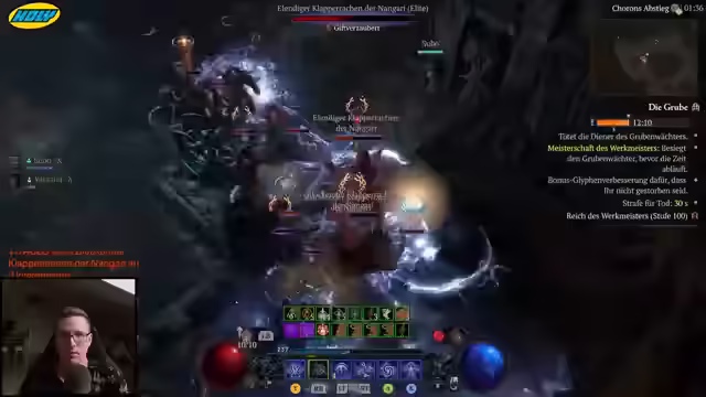 05:43:09Die Pit 100 Challenge wird angegangen, wobei der erste Build getestet wird. Fragen zu Hydra-Builds werden beantwortet, wobei die Bedeutung der Basisattacke zur Schadenserhöhung hervorgehoben wird. Es wird festgestellt, dass die Glyphen für maximalen Schaden noch maximiert werden müssen. Der Streamer passt den Paragonbaum an, um genügend Willenskraft für einen Bonus zu erreichen, und tauscht dafür Geschicklichkeitspunkte um. Es wird überlegt, ob noch Glas-Kanone-Werte erzielt werden sollen. Runen werden überprüft, um sicherzustellen, dass sie korrekt sind, was den Schaden von Knisternder Energie weiter erhöht. Glyphen müssen noch gelevelt werden. Der Schaden von Knisternder Energie kommt durch die Schockwelle, während bei anderen Builds der Schaden von den Combo-Blitzen kommt. Als nächstes soll Ball-Lightning gespielt werden. Es wird festgestellt, dass die Aspekte passen und der Boss schnell besiegt wird. Der Streamer ist stärker ausgerüstet als im PTR, auch dank der Triple Hits.