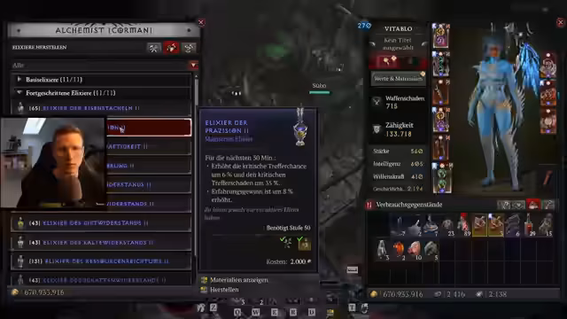 00:22:32Der Fokus liegt auf der Verbesserung der Ausrüstung für den Spiritborn. Der Streamer stellt fest, dass viele Gegenstände noch nicht vollendet sind und Intelligenz-Knoten fehlen. Beim Genauerraten der Attribute entsteht eine Verwirrung: Ein Attribut zeigt einen Anzeigefehler bei 59,96% an, obwohl es bei 60% sein sollte. Dies führt zur Entscheidung, Glyphen zu leveln, um den Schaden zu steigern und die Statistiken zu verbessern. Es wird diskutiert, welches Elixier für den Build am besten geeignet ist.