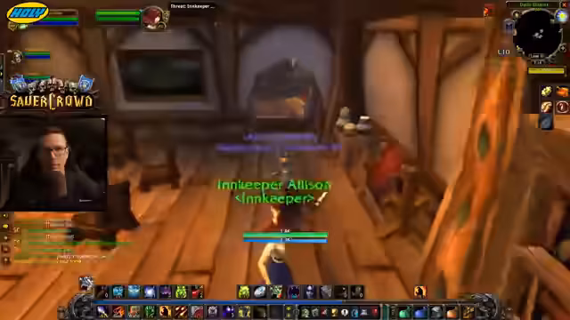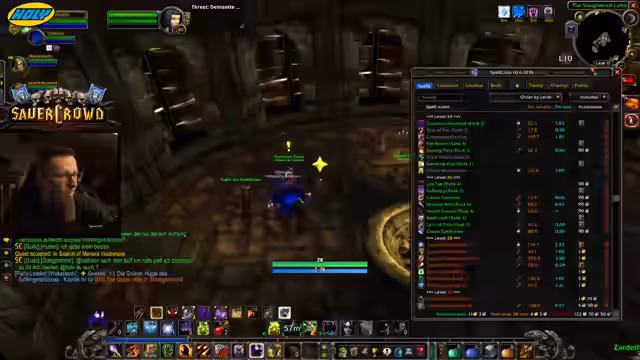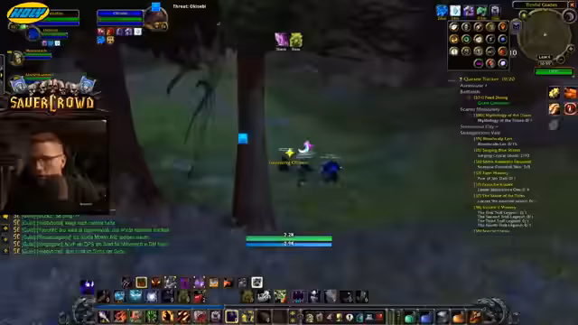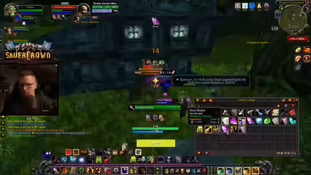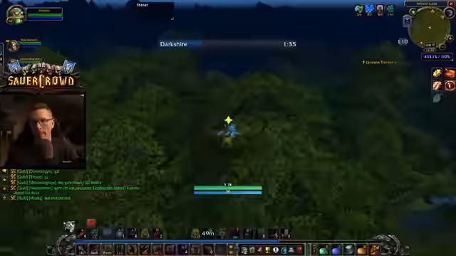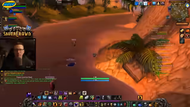 01:55:11Während der Quest stoßen neue Mitspieler hinzu, die per Gilden-Map den Streamer und seinen Begleiter gefunden haben. Ein Spieler, Martin, ist Level 40, ein anderer, Wakayashi, Level 35. Es entwickelt sich ein lockeres Gespräch über die Klassen und Level der Charaktere. Gleichzeitig spricht der Streamer über die aktuelle Community-Dynamik in World of Warcraft Hardcore. Er erwähnt festes Fünfer-Gruppen, von denen einige wünschen, dass sich diese auflösen, und zitiert einen Clip eines Haters, der das Sauerkraut-Event kritisiert.