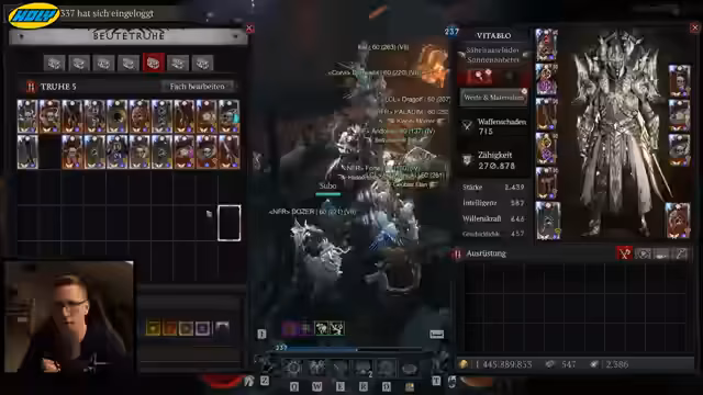 00:44:14Vitablo gambelt Obolus-Kisten, um bessere Handschuhe und Ringe für seinen Build zu erhalten. Er benötigt speziell Ringe mit Stärke, Crit Chance, Attack Speed und Max Life. Nach mehreren Fehlversuchen handelt er mit Viewern, um passende Ringe für 200 Millionen Gold zu erwerben. Dabei erwähnt er Probleme mit accountgebundenen Items und diskutiert die Herausforderungen beim Crafting ohne ausreichend Obduzid.