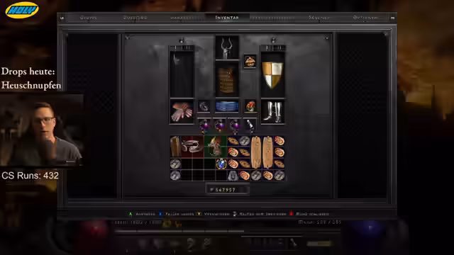 01:47:45Der Streamer berichtet davon, dass er erstmals auf Instagram gepostet hat, und zeigt sich selbstironisch als Influencer. Er erwähnt seinen Bruder als Kameramann. Das Spielziel bleibt langfristig der Bau einer Enigma-Rüstung, wobei er aktuell mit einer Kolosswülge spielt. Er handelt aktuell mit Lämm-Runen und versucht, seine Sammlung aufzuwerten.