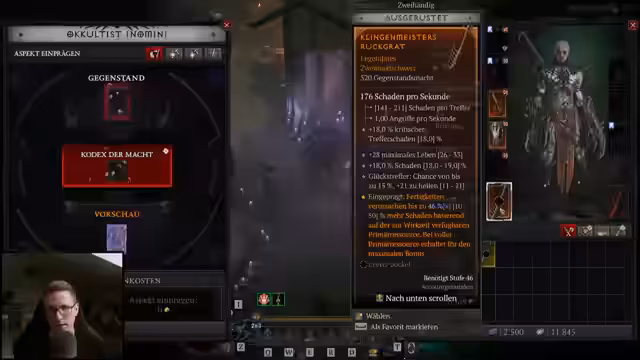 01:53:24Der Streamer stellt fest, dass er trotz guter mythischer Items und des Spielens auf der niedrigsten Schwierigstufe zu wenig Schaden mit seinem Blutwoge-Build macht. Es wird die Ursache in der mangelhaften Ausrüstung vermutet. Er experimentiert mit Aspekten, wie dem Klingenmeister und dem Lokran's Talisman, und stellt fest, dass viele Aspekte wie der Blutwoge-Aspekt auf der Zweihandwaffe wirkungslos sind. Gleichzeitig wird die ineffektive Nutzung von Chaos-Vorteilen im Build kritisiert.