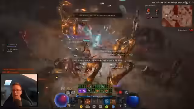 03:38:01Der Stream beginnt mit einem Experimentiercharakter, versehentlich ohne die neue Waffe ausgerüstet, was zu unerwarteten Energieproblemen führt. Nach technischen Schwierigkeiten mit dem Download startet das Spiel und der Spieler erkundet eine große Questregion, wird in eine Ziege verwandelt und sammelt nachfolgend Quests. Nachdem er eine Bandit-Truppe besiegt hat, entscheidet er sich für eine Blitz-Zauberer-Spezialisierung, wobei er Skills wie Teleport und Thunderstorm wählt und deren Synergien analysiert. Er stellt auch fest, dass seine elementaren Resistenzen niedrig sind und sein Gameplay im Vergleich zu Diablo langsamer und taktischer ist.