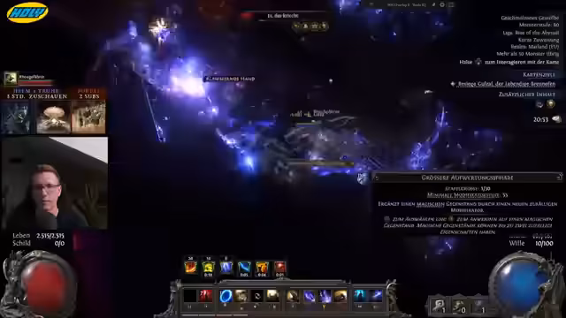 00:15:16Zu Beginn des Streams wird das Thema der neuen Diablo-Season angesprochen, da der Streamer nicht zwei Wochen vor deren Start in Diablo spielen möchte. Der Fokus liegt auf der aktuellen Path of Exile-Saison. Es werden technische und persönliche Probleme erwähnt, die den Start verzögern. Der Streamer kündigt an, in den gereinigten Maps mit drei Türmen und Nexus-Sphären zu farmen, um Orbs zu sammeln und einen guten Magic-Find-Wert zu erzielen. Geplant ist auch ein Preischeck für neu erworbene Items, darunter neue Handschuhe und ein Ring.