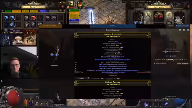 04:46:57Ein Zwillingsbogen mit dem Affix 'plus zwei zusätzliche Projektile' ist extrem selten und wertvoll. Er kann nur an einem Item Level 82 droppen und wird von Spielern gesucht, um mit der brüchigen Sphäre tier Mirror-Bögen zu craften. Sein Wert lag bei elf Divine Orb, ist aber nun auf rund 400 Exalted Orbs gesunken. Eine falsche Suche kann den Wert erheblich verfälschen.