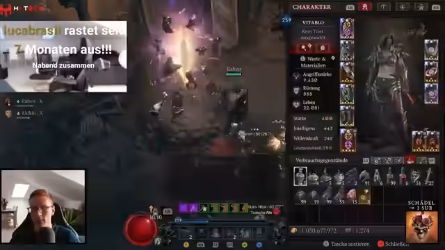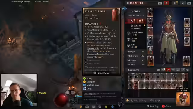 02:00:07Im Detail bewertet der Streamer verschiedene Items für den Hydra-Build. Er kommt zu dem Schluss, dass die T-Bowel-Hose wahrscheinlich besser ist als die alternative axiale Hose, da sie mehr Rüstung und Ressourcen bietet. Er ist auf der Suche nach einem Tarascha-Ring mit einem besseren Generischen Affix (GA) als den bisherigen 21%-Roll. Auch der Core-GA für den Hydraskill wird als interessante Option identifiziert. Um die für den Build notwendige Max-Ressource zu erreichen, ist er auf Items mit diesem GA und passiven Ressourcen-Erzeugung angewiesen. Das Farmen nach diesen speziellen Items hat bereits begonnen.