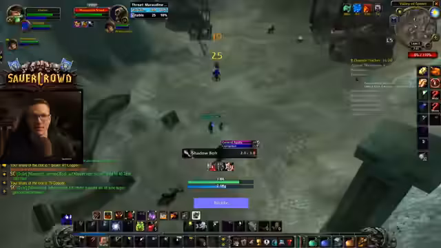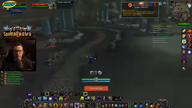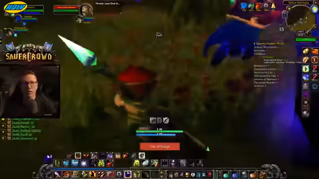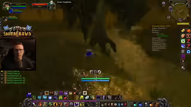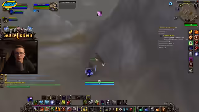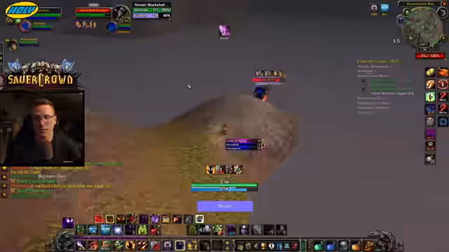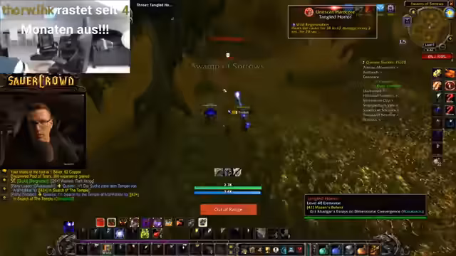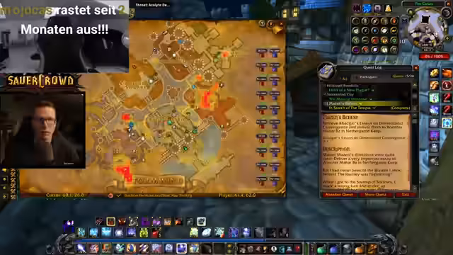 01:59:14Die Escort-Quest "Get me out of here" wird gestartet, bei der sie den NPC Melissa Brunbusel begleiten. Die Herausforderung liegt in der hohen Monsterdichte, darunter Elitemobs und vier Gegner auf einmal, was zur Panik führt. Probleme mit Buffs und Mana-Management treten auf, insbesondere da Buff Food und Int-Buffs optimal genutzt werden müssen. Der NPC flieht schließlich nach einem Kampf, was zum Scheitern der Quest führt, und vitablo wird mit toxischen Chat-Kommentaren konfrontiert, die er zurückweist und für Jugendsprache entschuldigt, während er sich von Beleidigungen distanziert.