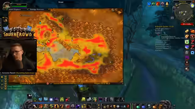 02:11:18Nach dem Scheitern der Escort-Quest entscheidet sich vitablo für ein Portal nach Stormwind, um die Quest abzugehen und neue Quests zu übernehmen, darunter versorgende Quests für Nethergard. Der Chat empfiehlt den Weg durch die Blastedlands und Deadwind Pass, um die Sümpfe des Elends zu erreichen, wobei rote Flecken auf der Karte als potenzielle Gefahrenzonen identifiziert werden. Die Planung umfasst das Teilen von Quests, das Fliegen nach Booty Bay und das Annehmen von Quests in Stormwind, mit Betonung auf die Sicherheit durch Vermeidung von Horde-Patrouillen und PvP-Flaggen.