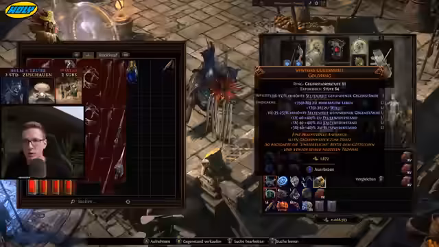 00:24:54Die Suche nach einem geeigneten Ring gestaltet sich schwierig, insbesondere aufgrund des Bedarfs an Chaos-Resistenz. Es wird nach Ringen mit prismatischen Eigenschaften oder Hybrid-Mods gesucht, um mehrere Resistenzen gleichzeitig zu decken. Die Schwierigkeit, den letzten Ring zu finden, der alle fehlenden Resistenzen ausgleicht, wird betont. Es wird die Möglichkeit in Betracht gezogen, einen Rubin- oder Topaz-Ring zu finden, um einen Widerstand durch die Ring-Basis zu fixieren. Die Seltenheit von Ringen mit Hybrid-Eigenschaften, insbesondere Chaos-Resistenz, wird hervorgehoben. Die Überlegung, einen Goldring zu finden, der Kälte, Feuer, Blitz und Chaos-Resistenz bietet, wird diskutiert. Es wird die Möglichkeit in Betracht gezogen, den Helm doch wieder zu wechseln, da es schwer ist einen passenden Ring zu finden. Es wird eine Suche gestartet, aber es werden keine passenden Ringe gefunden, die die benötigten Resistenzen abdecken und gleichzeitig andere gewünschte Eigenschaften wie Magic Find bieten.