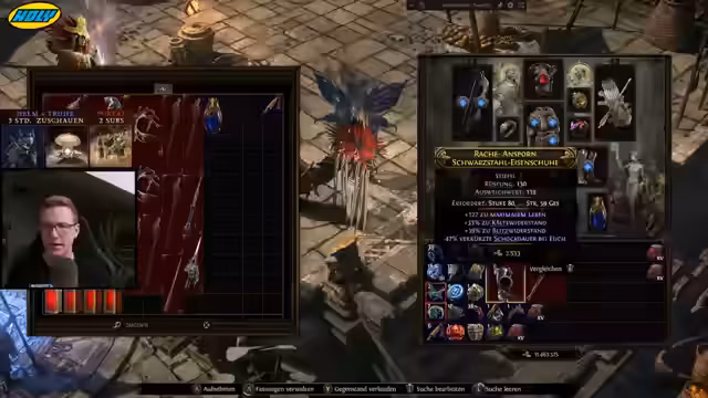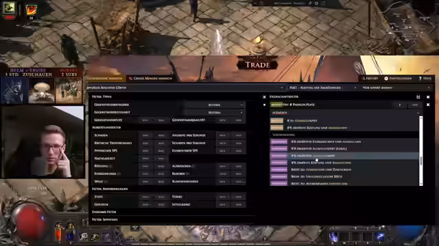03:12:37Der Streamer erlebt einen außergewöhnlich guten Tag mit zahlreichen wertvollen Drops und freut sich über zweistellige Divine Orb-Einnahmen. Ein Ringkauf für 23 Divine wird erwähnt, der die spezifischen Anforderungen des Streamers erfüllte, insbesondere Leben, Triple Resis und Damage. Es wird die Suche nach einem zweiten Ring mit zwei Resistenzen und Magic Find erwähnt. Ein seltener Stiefel-Modifikator, der 1% Bewegungsgeschwindigkeit pro 15 Wille gewährt, wird zunächst als sehr wertvoll eingeschätzt, aber nach genauerem Lesen der Beschreibung als weniger nützlich für den aktuellen Build erkannt. Es wird festgestellt, dass dieser Modifikator hauptsächlich für Minion-Nekros interessant ist, was die Nachfrage stark einschränkt. Der Streamer erläutert die spezifischen Anforderungen an Ringe und Helme, insbesondere in Bezug auf Resistenzen (Feuer und Chaos) und den Wunsch nach physischem und Blitzschaden sowie Magic Find. Ein Vendor wird als der beste bezeichnet, den der Streamer je gefunden hat, obwohl er nicht perfekt ist. Es wird über die Schwierigkeit gesprochen, die passenden Items zu finden, und Anpassungen am Suchfilter vorgenommen.