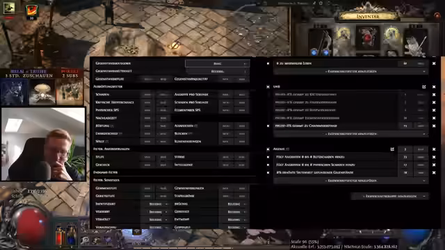00:38:03Es erfolgt eine Neubewertung der benötigten Resistenzen, beginnend mit einer Analyse der aktuellen Werte ohne bestimmte Ausrüstungsteile. Die benötigten Werte für Feuer-, Kälte-, Blitz- und Chaosresistenz werden notiert, um die Suche nach einem geeigneten Ring und Helm zu optimieren. Es wird die Strategie angepasst, primär nach einem Ring zu suchen, der bereits viele Resistenzen abdeckt, um den Rest dann mit dem Helm zu fixen. Die Schwierigkeit, Ringe mit den benötigten Eigenschaften zu finden, wird erneut betont. Es wird festgestellt, dass Feuer und Chaos die größten Herausforderungen darstellen. Die Möglichkeit, Resistenzen über Sockelfassungen im Helm zu maximieren, wird in Betracht gezogen. Das Craften von Ringen wird als schwierig und wenig zielstrebig angesehen. Ein Gamble-Projekt mit einer Rüstung wird gestartet, wobei der Einsatz von Wahlorbs im Vordergrund steht. Es wird erwähnt, dass Offstream eine hohe Erfolgsquote mit Chaosorbs erzielt wurde, während im Stream bisher eher Sockelfassungen das Ergebnis waren.