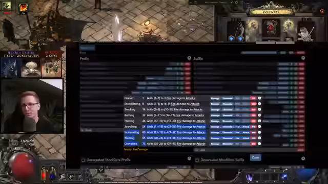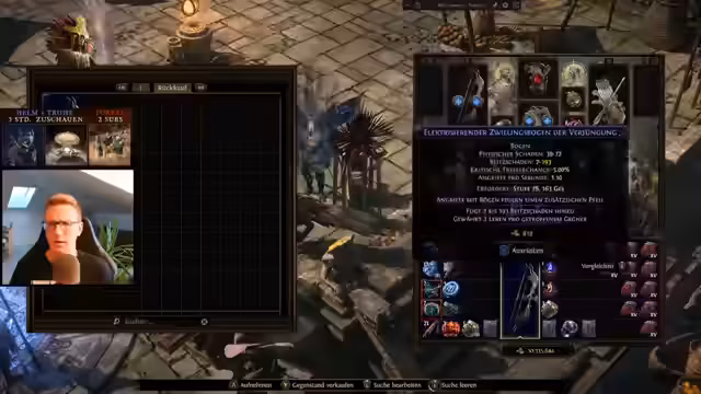 02:51:51Ein Chat-Frage zur Wahl zwischen einem High-DPS-Bogen und einem mit Bonus-Attributen wie Projektilen oder Angriffsgeschwindigkeit wird beantwortet. Eine genaue Berechnung ist ohne Auswertung aller Bild-Daten nicht möglich. Eine Essenz, die 20% extra Blitzschaden gibt, wird als Low-Budget-Option eingestuft, da sie schlechter als physischer Schaden ist. Das Omen der Kristallisierung wird als strategisches Werkzeug erklärt, um Suffixe garantiert in Präfade zu verwandeln und gezielte Upgrades zu ermöglichen, selbst wenn die Eigenschaft nicht ideal ist.