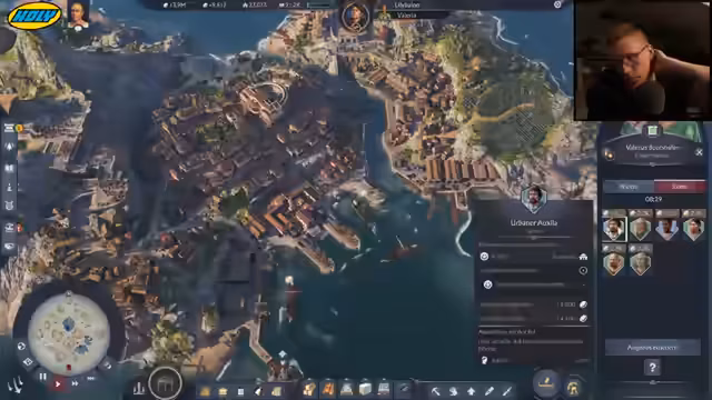 00:15:13Der Stream beginnt mit dem Start von Anno 117. Der Streamer grüßt seine Zuschauer und wünscht einen schönen Release. Er zeigt seine Hauptstadt in Latium, die bereits einen Stadtstatus 8 hat und eine klein aber fein erscheinende Metropole darstellt. Er erwähnt, dass das Spiel relativ lange geladen hat und besorgt ist, ob sein Savegame noch funktioniert. Er stellt fest, dass das Spiel optisch hübsch aussieht, auch ohne auf Schönbau zu setzen, dank Marmorstraßen und Patricia.