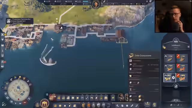 02:38:28Der Streamer nimmt eine Quest an, die ein Schiff zum Kontor erfordert, und kauft neue Schiffe wie die Quinquereme. Er analysiert die Unterschiede zwischen verschiedenen Schiffstypen, darunter Hippocampus und Quinquereme, und stellt fest, dass Quinquereme zwar langsamer sind, aber mehr Platz bieten. Gleichzeitig kümmert er sich um den Bedarf an Gesundheit und Ansehen durch spezielle Gebäude wie Waffenschmieden und Wohnhäuser.