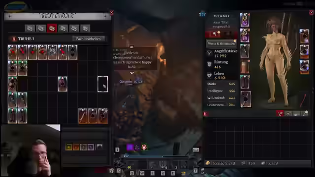 01:33:18Die letzten Wellen der Äthergenerierung stehen an, wobei das Ziel ist, mit mehr Schaden mehr Äther zu generieren. Es wird festgestellt, dass die Gegner etwas zu lange überleben, was die Ätherausbeute beeinträchtigt. Die Fähigkeit der Massen, sich neu zu bilden, wird positiv hervorgehoben, da sie viel Äther verlieren. Es wird angemerkt, dass das Erreichen von 1000 Äther es ermöglicht, Bartok zu beschwören und die Truhe zu öffnen. Allerdings wird bedauert, dass die Bonusmassen zu spät kamen, was die potenziell höhere Ätherausbeute verhinderte. Es wird ein Kampf absolviert, der nicht sofort gewonnen werden kann, und es wird nach Herdungsanleitungen gesucht, die gefunden werden. Der gefundene Ring mit GA Entschlossenheit wird als stark bewertet, aber es wird entschieden, ihn vorübergehend zu tragen, bis die anderen benötigten Gegenstände gefunden sind. Ein Amulett mit Geschicklichkeit in Prozent wird gefunden und vorerst aufgehoben. Es wird überlegt, welche Gegenstände sofort angezogen werden können, wobei der Fokus auf dem Amulett liegt, dem jedoch offensive Aspekte fehlen. Es wird erwähnt, dass die beiden Aspekte vom Build noch fehlen.