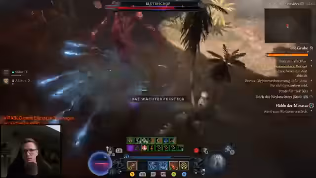 04:04:59Nach intensivem Farmen gelingt es dem Streamer, die letzte fehlende Glyphe 'Klaue' für seinen 'Zerschmetternde Hand'-Build zu finden. Damit sind alle notwendigen Items und Glyphen für den Build vervollständigt. Das Ziel des Tages ist erreicht. Bei einem kurzen Check des eigenen Streams bemerkt der Streamer einen technischen Bug, bei dem das Bild auf seinem Bildschirm verkleinert ist, während es für die Zuschauer normal erscheint. Dies ist für ihn ein Zeichen, den Stream für heute zu beenden. Er kündigt einen Offline-Modus an und verabschiedet sich von der Community.