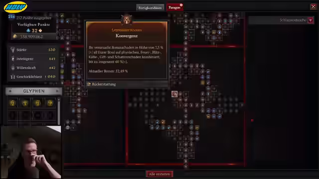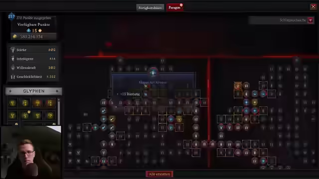 00:15:24Der Stream beginnt mit technischen Schwierigkeiten mit der Kamera, die jedoch schnell behoben werden. Es wird sich für Subs und Bits bedankt. Ein Zuschauer namens Wicked mochte die Intro-Musik nicht, woraufhin es zu einem Streit kam und der Zuschauer den Stream verließ. Seitdem wird keine Intro-Musik mehr gespielt, außer der leisen Diablo 4 Intro-Musik. Es wird über Paragon-Punkte und fehlende Skills gesprochen. Zuschauer geben Tipps, wie man den Sound im Spiel ausstellt, um Voice-Nachrichten zu deaktivieren, die für Blinde gedacht sind. Es wird über benötigte Glyphen gesprochen und festgestellt, dass noch keine der benötigten Glyphen vorhanden sind.