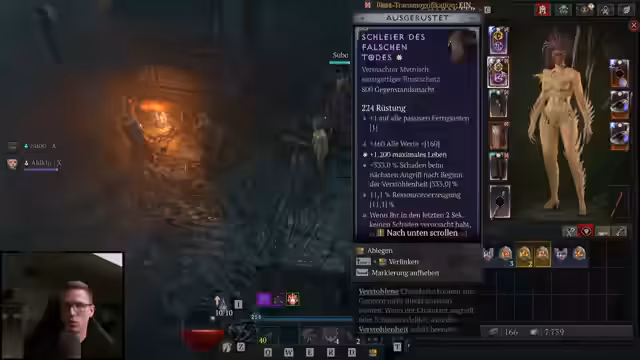 01:38:00Beim Ausrüsten seines Charakters trifft der Streamer strategische Entscheidungen. Er zieht ein Amulett mit Geschicklichkeit an, da es im Vergleich zu den bisherigen Items einen Vorteil bietet. Er wählt den Aspekt 'Eitler', da ihm keine bessere Option zur Verfügung steht und er auf einen starken Trefferstat setzt. Die Suche nach weiteren passiven Aspekten und Glyphen ist jedoch weiterhin ein zentraler Punkt, um seinen Schaden zu verbessern und die Qualitätsstufe zu meistern.