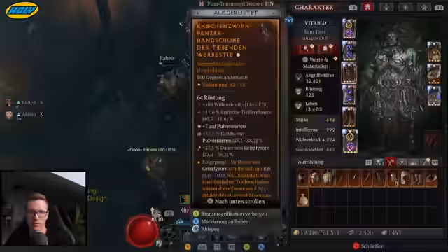 00:15:12Ein neues Spiel-Update ist aktiv, das den Grizzly-Zorn-Bug behebt und es ermöglicht, den Skill bei passiver Dauer permanent zu nutzen. Der Streamer farmt seit dem Patch aktiv Belial, um mythische Gegenstände zu finden und einen mythischen Funken zu erhalten. Nach 75 Runs wurden drei mythische Gegenstände gedropt, darunter der sehr nützliche Stab von Ahavarion, der für alle Builds stark ist.