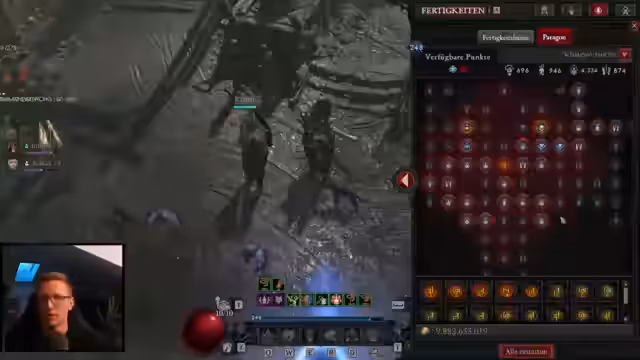 02:11:46Nachdem alle Items gehärtet sind, beginnt die Phase der finalen Optimierung. Es werden Juwelen in die Items gesetzt und der Paragon-Baum wird angepasst. Der Streamer stellt fest, dass der Paragon-Baum für das Pulverisieren-Bild stark dem des Erdspieß-Bilds gleicht und eine komplette Neuskillung nicht nötig gewesen wäre. Die Ressourcen werden im Paragon-Baum so verteilt, dass Werte wie Willenskraft und Angriffstempo maximiert werden, um die Schadensausbeute zu erhöhen.