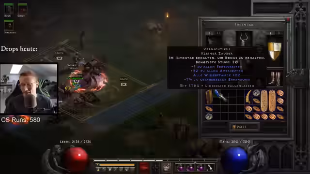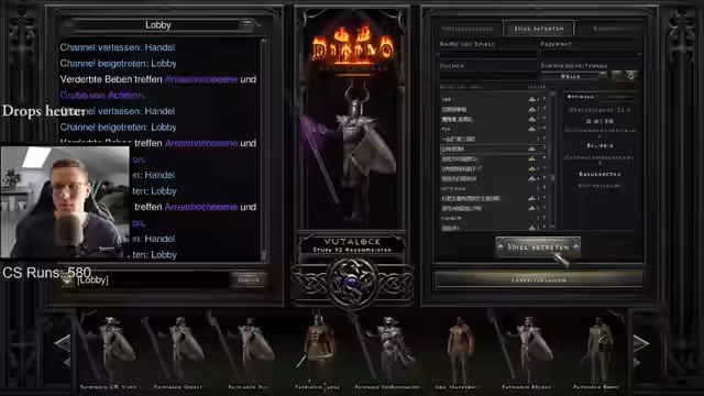 00:54:55Der Streamer bereitet seinen Charakter für den Eintrag in die Chronik und den Start von Ultimate Tristram vor. Er identifiziert den zuvor erhaltenen Annihilus und tauscht mehrere Charms aus, um seine Resistenzen zu maximieren. Zudem diskutiert er die benötigte Ausrüstung, wie eine Verratrüstung und ausreichend Leben, um den harten Dungeon zu bestehen.
