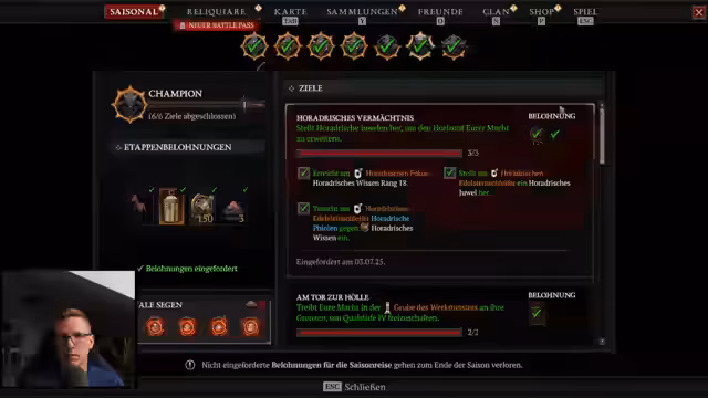 00:14:57Nach dem Start begrüßt der Streamer sein Publikum und kündigt an, heute den Charakter auf den Kettenblitz-Build umzubauen. Er berichtet von einem erfolgreichen Handel kurz vor Stream-Ende und hat nun 15 Milliarden Gold. Der Build erfordert einige Items auf Level 8 und Glyphen, die er farmen will. Zuerst spielt er noch die Hydra, um einige Elixiere und Glyphen aufzuleveln. Er bemerkt, dass sein Streamstart heute etwas später war, und entschuldigt sich dafür.