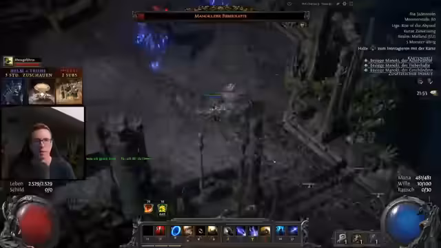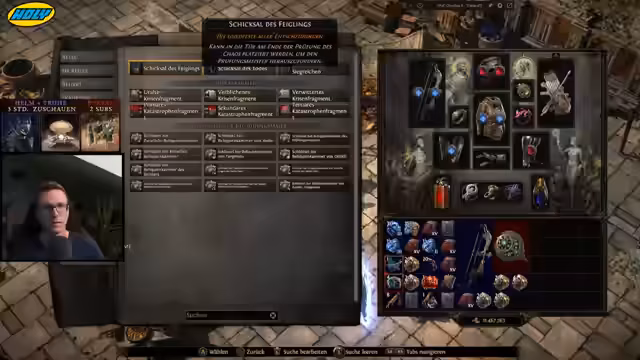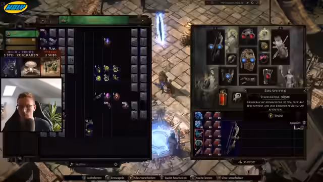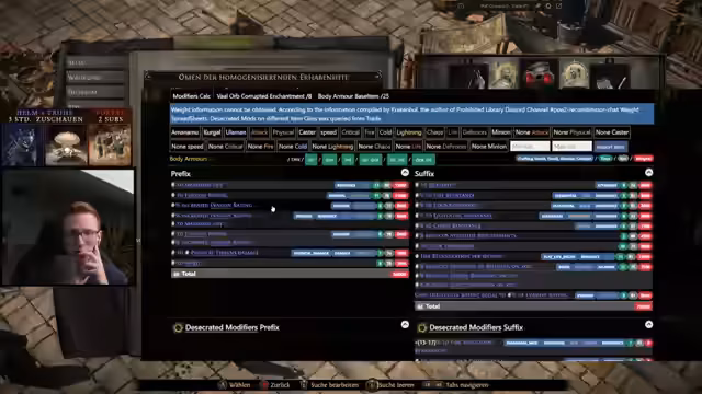 02:35:03Es wird angekündigt, dass es gut wird, wenn man sich Chaosrüstung anschaut. Es wird erklärt, dass man mit Energieschild oder Energieschild-Ausweichen-Hybrid spielt, wenn man im Endgame nicht sterben will. Es wird sich über eine perfekte Schmiede gefreut, die gefunden wurde. Es wird überlegt, ob sich das Stash-Bundle lohnt und welche Stashes bereits vorhanden sind (Currency, Skill, Map, Sockel, Essenzen, Unique, Delirium, Händler). Der Delirium-Stash wird als Scam bezeichnet, da nur 10 Items reinpassen. Es wird erklärt, dass Delirium-Maps automatisch in den Stash gehen. Es wird auf einen Artikel auf vitablo.de zum Thema Lootfilter verwiesen. Es wird von einem Gambler berichtet, der 3 Millionen für Ringe ausgegeben hat und nur Schrott bekommen hat. Es wird erklärt, dass man noch viel stärker werden kann, indem man teure Items craftet. Es wird der Spielspaß am Craften betont. Es wird erwähnt, dass man 6 Mod T15 Maps ohne Delirium farmt, aber in Zukunft gerne dreimal Delirium draufknallen würde. Roggen und Blackout werden für ihre Subs gedankt. Es wird überlegt, zwei Omen gleichzeitig beim Craften zu nutzen, was bisher fälschlicherweise für unmöglich gehalten wurde. Es wird überlegt, das Präfix-Omen und das homogenisierende Omen gleichzeitig zu nutzen. Es wird überlegt, eine Godlike Rüstung zu machen, aber es könnte beim Präfix mit Life plus Evasion Rating scheitern. Es wird überlegt, eine super gute Rüstung anzustreben oder einfach die Essenz draufzuhauen und auf eine 30x Rüstung zu gehen. Es wird beschlossen, wieder Chaos Resi zu nehmen und zu pokern, dass man gleich mit einem Exalted Orb was Gutes trifft.
