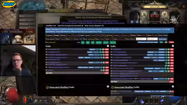 04:00:29Bei einem neuen Craft-Versuch macht der Streamer einen entscheidenden Fehler, der das gesamte Projekt ruinieren könnte. Er legt die falsche Reihenfolge bei der Anwendung von Omen-Orbs fest, was zu einem wertlosen Modifikation führt. Frustriert über diesen weiteren Misserfolg entscheidet er sich, die Rüstung aufzugeben und als wertlos zu betrachten.