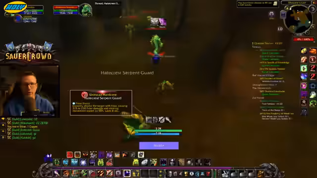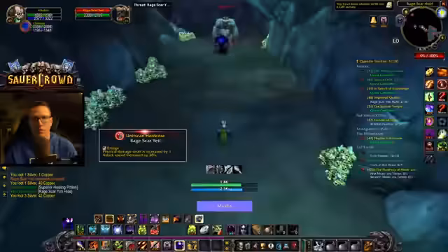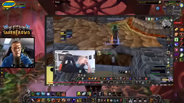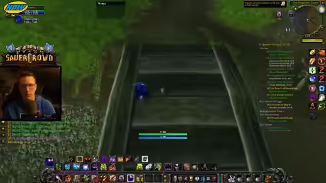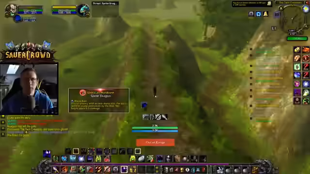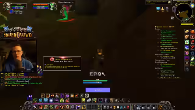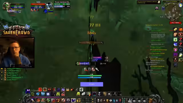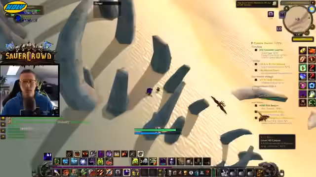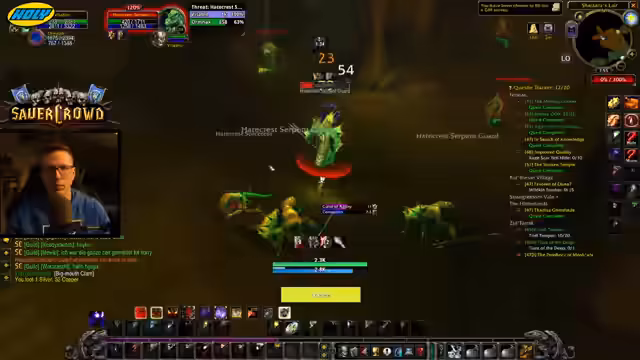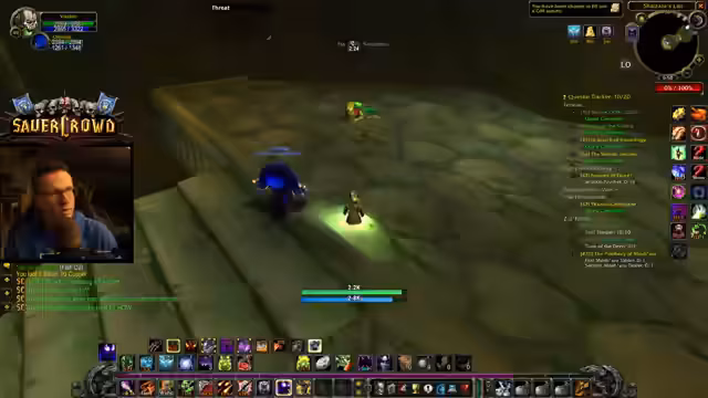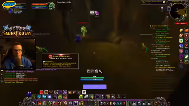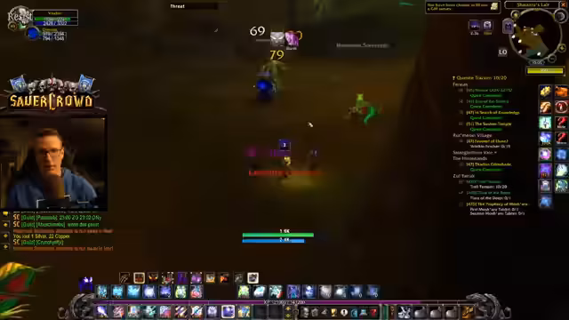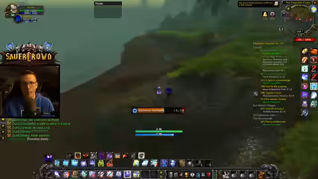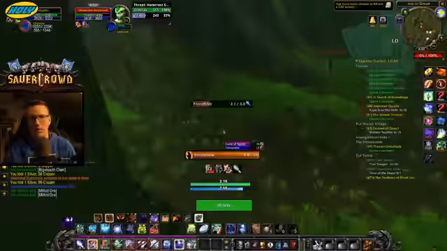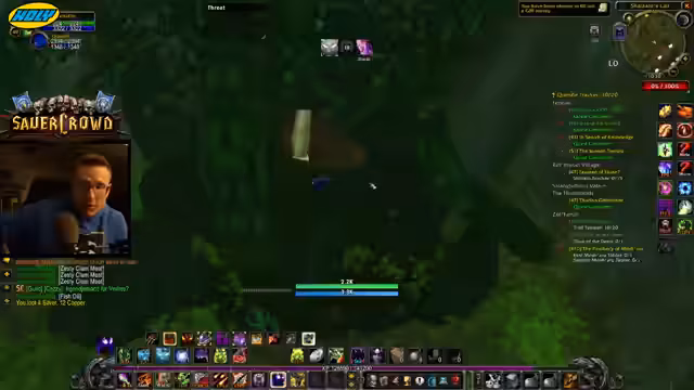 05:32:23Nachdem er eine einfache Escort-Quest abgeschlossen hat, wagt sich der Streamer in die "Freedom for all creatures"-Quest in Nargus. Diese führt ihn in eine Höhle mit einer hohen Mob-Dichte und einem roten Markierungsfeld auf der Karte. Trotz seines Levels ist er vorsichtig und bufft sich mit "Light of Elune" und "Siphon Life" vor dem Kampf. Er trifft auf den Boss Lord Shalzaru, den er und ein Hunter mit Hilfe von einem Pet und Magie besiegen.