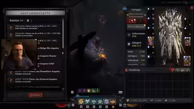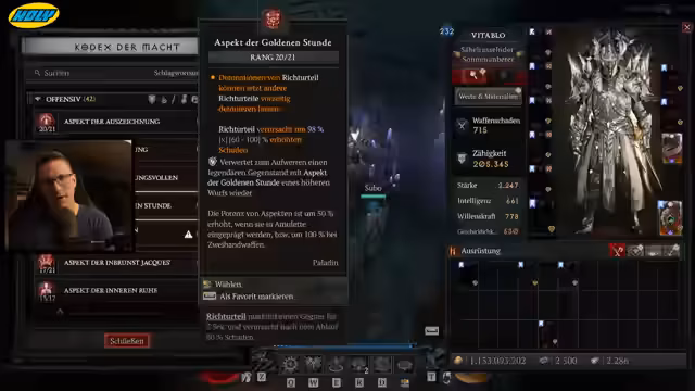 01:10:11Der Streamer testet mythische Gegenstände. Eine mythische Rüstung wird gehärtet, wobei der Aspekt 'Erhaltet für 4 Sekunden 20 Rüstung und 2 Widerstände pro 7. verbrauchten Glauben' (max. 50 Stapel) hinzugefügt wird. Praxistest mit einem Hammerdien-Build zeigt jedoch nur ~2.200 Rüstungszusatz bei optimaler Stapelung – als nicht optimal bewertet. Es folgt ein Test der Waffenchancen und Runen (Bug-Ohm, Igni).
