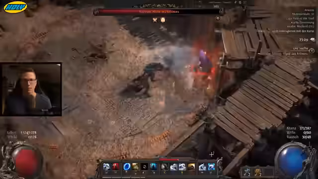 03:34:50Im PoE 2-Kampf gegen den Affenkönig (Monkey King) erlebt der Streamer unerwartete One-Shot-Mechaniken. Ein scheinbar harmloser Kreis erfordert Positionierung im Inneren – ein Lernprozess, der mehrere Versuche benötigt. Trotz der Herausforderung lobt er das visuelle Design der Kämpfe. Später diskutiert er permanente Belohnungen (Element-Resistenzen) in Prüfungen und vergleicht deutsche mit englischen Begriffen (z.B. 'Helmsklamm' vs. 'Helm's Deep').