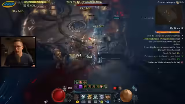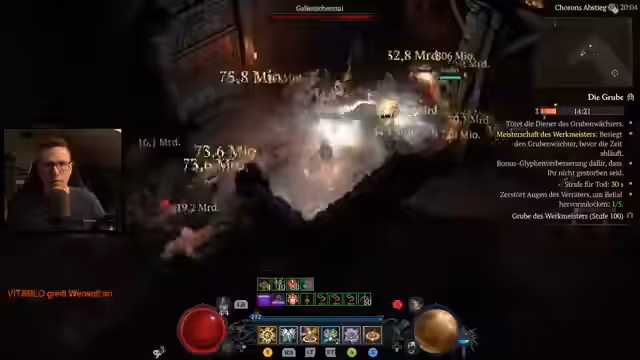 01:20:38Mit dem optimierten Hammerdien-Build (inklusive Klingenmeister-Aspekt) wird ein Run durch die Grube gestartet, um den Schaden zu testen. Paragon-Punkte werden neu verteilt, wobei Fokus auf Stärke-Knoten und Glyphen-Skalierung liegt. Diskutiert wird die Effizienz von ausgelösten Fähigkeiten gegenüber aktiven Hammerschlägen.